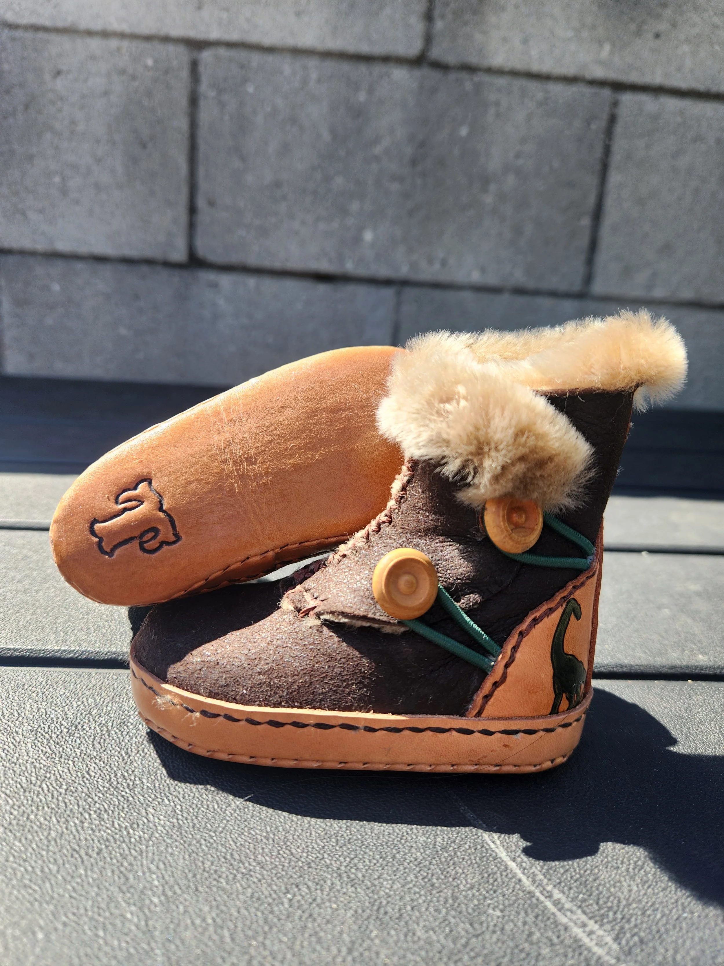 Dino Baby Boot Super soft hair on hide uppers, custom tooled and dyed veg tan details. Cozy baby booty.